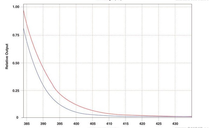 名義紫外照射 OPTI-LUX™ 365典型波長輸出圖,紅色為不配黑色濾色片的波長輸出,藍色為配黑色濾色片的濾長輸出,峰值都是365nm。 配及不配內(nèi)置黑色濾色片時波長輸出 當 OPTI-LUX™ 365的波長進入可見光范圍時,在400nm波長時,配有黑色濾色片可顯著降低強度達50%。