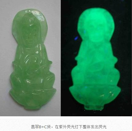 翡翠B貨、B+C貨都經(jīng)歷了強酸浸蝕、有機膠充填或者充蠟的處理過程。在紫外熒光燈照射下,有機膠和蠟都會發(fā)出明顯的紫外熒光,也就是整個翡翠出現(xiàn)均勻的紫外熒光,視為處理翡翠。天然翡翠因不含有機膠和蠟,在紫外熒光燈下不會發(fā)出紫外熒光。