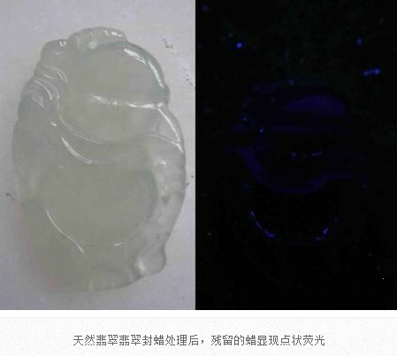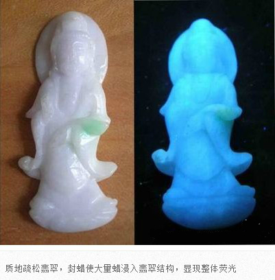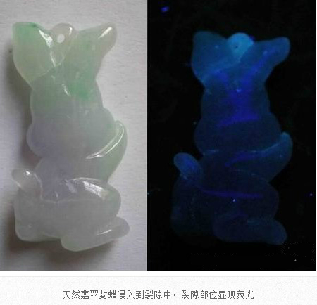 翡翠成品在雕刻成為毛坯后,在拋光前,都會進行封蠟處理,封蠟后可使蠟在拋光后進入翡翠表面存在的微細凹坑或裂隙中,填補其不平,使翡翠顯得更加圓潤,增加其光亮程度亮,還可防止油漬的進入。當然,封蠟的最主要的目的就是為了掩蓋裂紋。由于有蠟存在于翡翠中,在紫外熒光燈下會產(chǎn)生明顯紫外熒光。